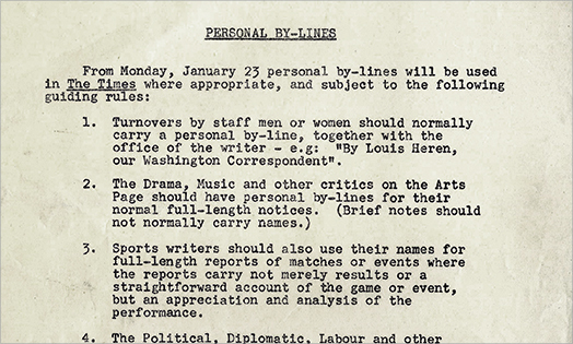 The Times’ policy of anonymity is overturned and bylines are used by principal staff correspondents.