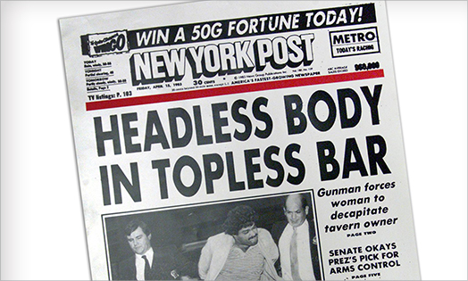 In April 1983, the New York Post publishes what will become one of its most famous covers: “Headless Body in Topless Bar.”